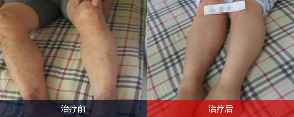 治疗的当天,周先生腿上的色素性紫癜开始消退,第二次治疗后,色素沉着样的瘀斑明显退散,周先生不禁发出感叹:6年的紫癜,终于治好了!后巩固治疗2次后,彻底康复。